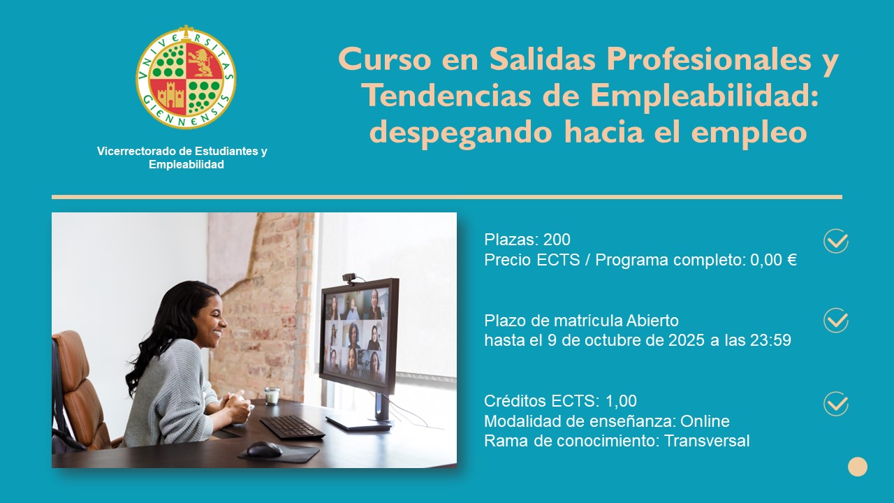 El Vicerrectorado de Estudiantes y Empleabilidad de la Universidad de Jaén organiza, para el curso 2025-2026, a través del Secretariado de Empleabilidad, Emprendimiento Estudiantil y Programa Alumni, un curso de formación orientado al alumnado, matriculado y egresado, para la búsqueda de empleo. Con un enfoque basado en competencias transversales y deseables en el desempeño profesional, se busca mejorar el conocimiento de la realidad laboral y capacitar en habilidades digitales básicas demandadas por las empresas.