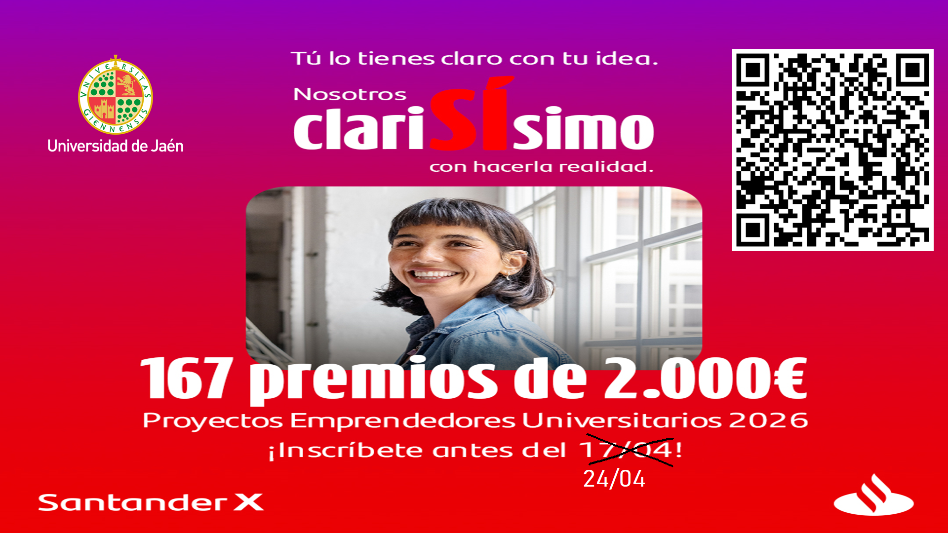 Banco Santander, S.A., promueve el programa “Santander X Spain Awards │Proyectos Emprendedores Universitarios 2026” que tiene como objetivo reconocer y potenciar a nivel nacional los mejores proyectos emprendedores universitarios de personas que guarden relación con alguna universidad que tenga convenio con Santander.