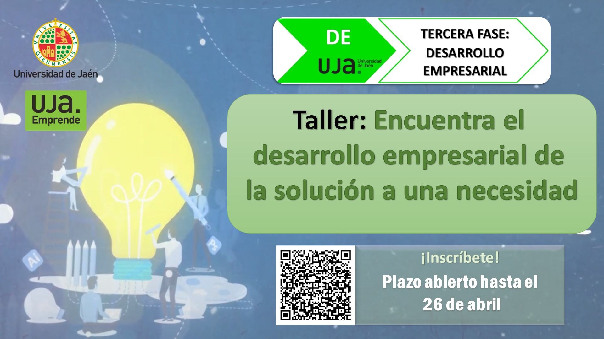 Con la publicaci贸n de la 3陋 Fase del Concurso de Emprendimiento INSIDE UJA 2025-26, el Vicerrectorado de Estudiantes y Empleabilidad de la UJA promueve la formaci贸n Encuentra el desarrollo empresarial de la soluci贸n a una necesidad con el objetivo formar a todo el alumnado matriculado y titulado que quiera participar en el concurso de emprendimiento, as铆 como, aprender a dise帽ar el desarrollo empresarial de una soluci贸n ideal a una de las necesidades identificadas que pueda llegar a ser un negocio.