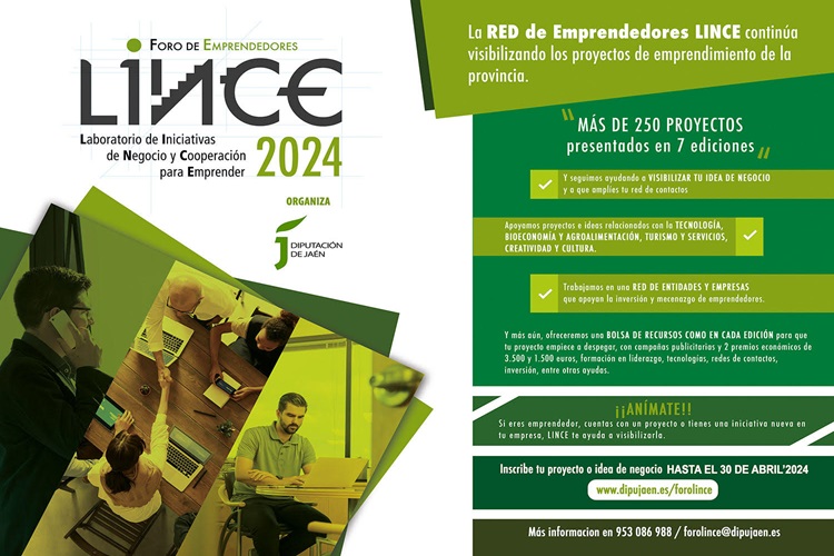 La Diputaci贸n de Ja茅n convoca una nueva edici贸n de su Foro LINCE, con el que pretende promover y fomentar el emprendimiento en la provincia. Hasta el 30 de abril podr谩n inscribirse los proyectos o ideas de negocio a la octava edici贸n de este programa, enmarcado en el Plan de Empleo y Empresa de la Administraci贸n provincial, al que se han presentado m谩s de 250 iniciativas desde su puesta en marcha. La Universidad de Ja茅n, junto con otras entidades p煤blicas y privadas de la provincia de Ja茅n, colabora en esta edici贸n.