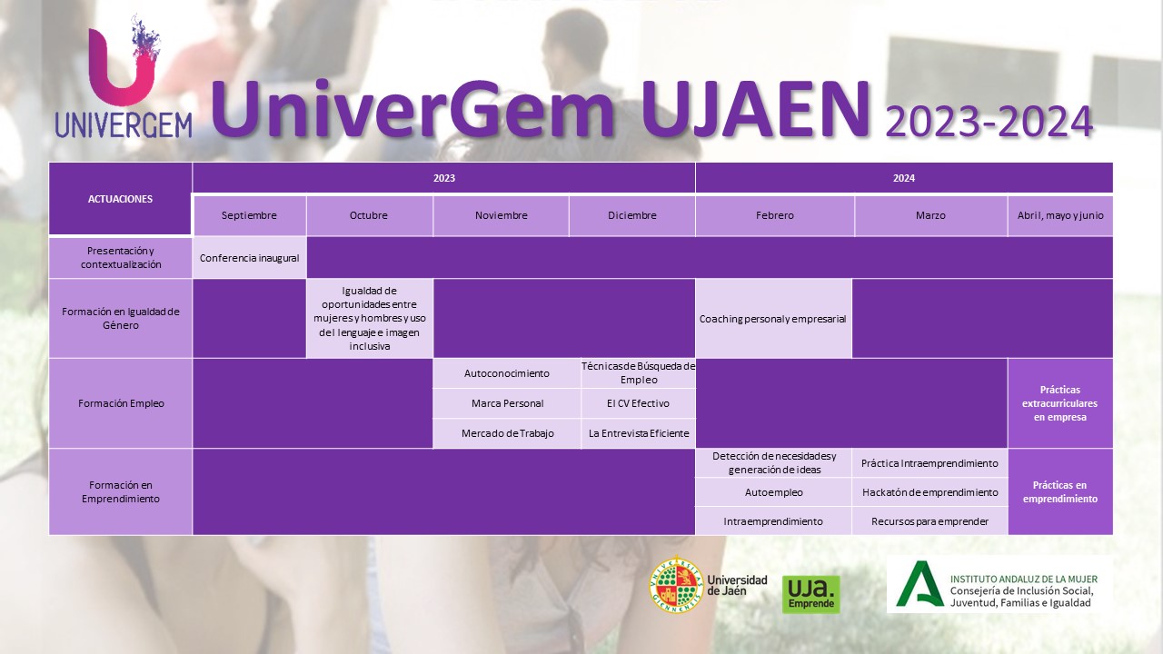 Abierto el plazo de solicitud para participar en la 4ª edición del programa UNVERGEM en la Universidad de Jaén, un programa financiado por el Instituto Andaluz de la Mujer de la Junta de Andalucía, que tiene como objetivo mejorar la empleabilidad de las mujeres universitarias a través de formación complementaria relacionada con el empleo y el emprendimiento, la realización de prácticas en empresas colaboradoras y prácticas de emprendimiento en los Viveros de Empresa de la Universidad de Jaén.