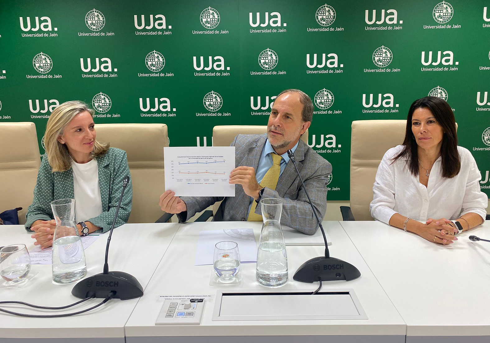 El Rector ha destacado que al año siguiente de concluir sus estudios (septiembre de 2022), el 74% de los titulados de la UJA se ubican entre la población activa, es decir, están trabajando o demandando empleo, mientras que el 26% restante no busca trabajo, justificado principalmente en la continuación de la formación a otros niveles. El desempleo de los titulados de la UJA, al año siguiente después de graduarse, se sitúa en el 14% frente al 25% de paro juvenil en la provincia y el 21% en Andalucía. “Este porcentaje ha ido disminuyendo y alcanza la cifra más baja de los últimos años”, ha recalcado Nicolás Ruiz. “Por lo tanto, si nos fijamos en lo que es el paro juvenil y la tasa de inserción laboral, la evolución en los últimos años de la Universidad de Jaén es altamente favorable y positiva”. Asimismo, se ha referido al hecho de que, en relación a la tasa de inserción laboral, sea del 60% para los hombres y del 55% para las mujeres, asegurando que “somos conscientes de esa realidad y vamos a trabajar a nivel de institución, particularmente a través del nuevo Vicerrectorado de Igualdad, Diversidad y Responsabilidad Social para conseguir una nivelación efectiva entre los hombres y las mujeres.